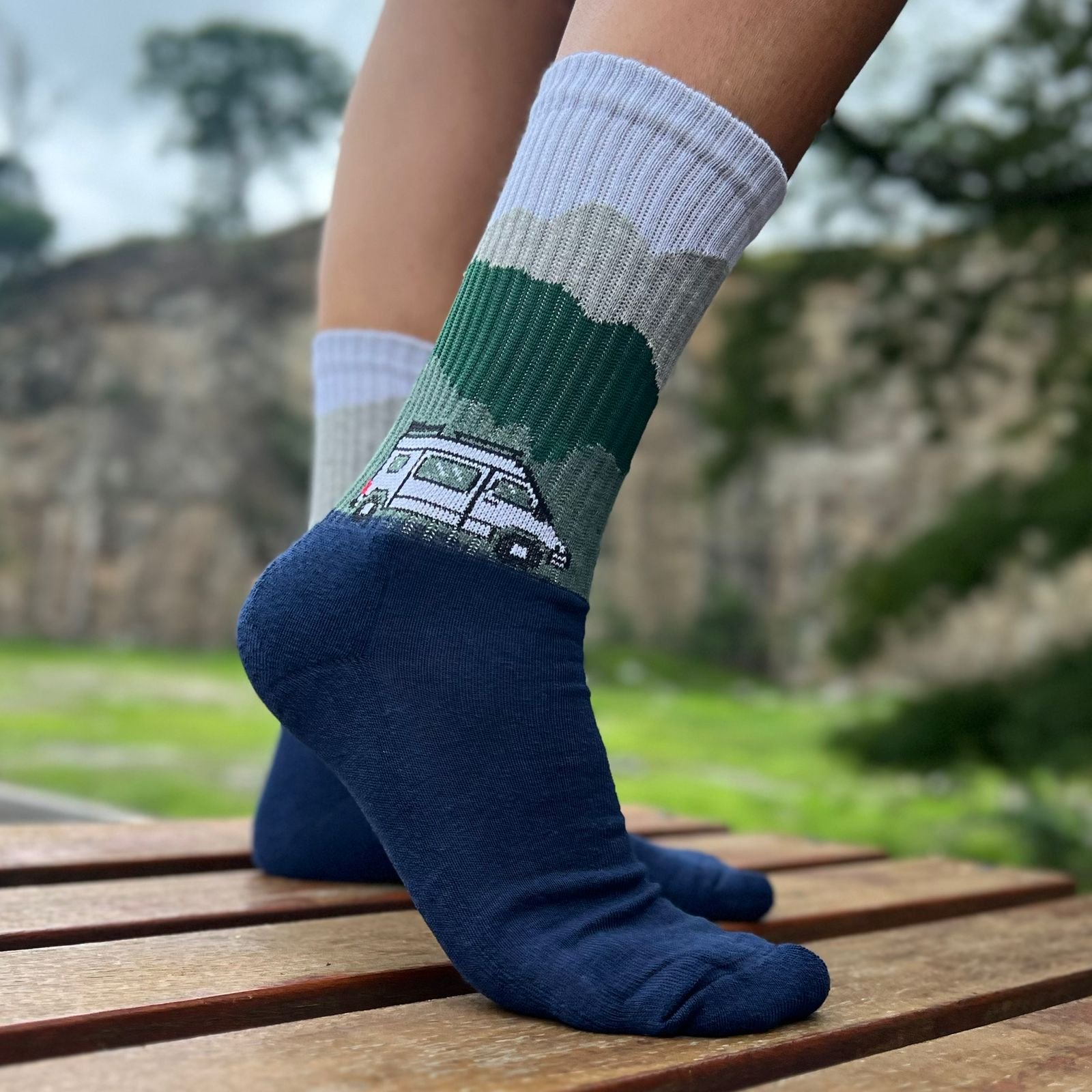 A meia Vandisseia na Estrada é um convite para viver intensamente. Representada com o desenho da van motorhome em meio às montanhas.
