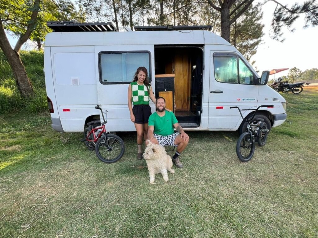 Dê e Roque, é um casal de atletas de BMX Freestyle que vive com sua cachorra em um motorhome (eles contam as aventuras em @vandisseia nas redes sociais).